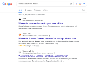 显然,搜索单单的产品关键词(也就是我们说的B2C关键词)你是无法找到你想要的结果的。那如果在summer dress前面加上wholesale呢?又会出现什么不一样的结果呢?